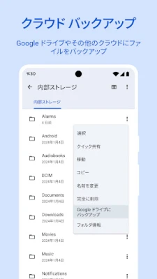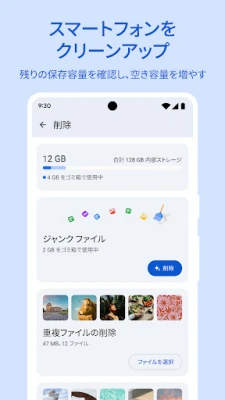 さらに、**Files by Google**はデバイスのストレージをさらに最適化する多彩な機能を提供します。貴重なファイルをGoogle ドライブやSDカードに簡単にバックアップし、デバイスの負担を軽減。他のクラウドストレージサービスとの連携もスムーズです。内蔵のメディアプレーヤーで、再生速度やシャッフルなどの詳細設定をカスタマイズしながら、保存した音楽や動画を心ゆくまで楽しめます。使うほど賢くなる削除候補の提案機能は、デバイスの健康状態を保ち、常に快適な動作をサポートします。そして、特筆すべきはその軽快さ。20MB未満の軽量設計でデバイスの容量をほとんど消費せず、広告表示一切なしで、シンプルかつ直感的なユーザー体験をお届けします。