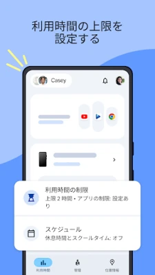 デジタル時代を生きるお子様を持つ保護者の皆様へ。スマートフォンの利用時間、どんなアプリを使っているか、そしてオンラインでの安全が保たれているか――。数々の疑問や不安を抱えることはありませんか?Google がお届けする**ファミリー リンク**は、お子様の健やかなデジタル成長をサポートするための一歩先を行くツールです。このアプリがあれば、お子様一人ひとりに合わせたデバイス利用の基本ルールを簡単に設定できます。例えば、就寝時間や学習時間を考慮した利用上限の調整、特定のアプリ利用制限や、学びを深める教育アプリの制限解除など、お子様の成長段階に応じた柔軟な管理が可能です。