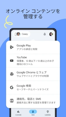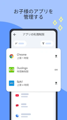 デジタル時代を生きるお子様を持つ保護者の皆様へ。スマートフォンの利用時間、どんなアプリを使っているか、そしてオンラインでの安全が保たれているか――。数々の疑問や不安を抱えることはありませんか?Google がお届けする**ファミリー リンク**は、お子様の健やかなデジタル成長をサポートするための一歩先を行くツールです。このアプリがあれば、お子様一人ひとりに合わせたデバイス利用の基本ルールを簡単に設定できます。例えば、就寝時間や学習時間を考慮した利用上限の調整、特定のアプリ利用制限や、学びを深める教育アプリの制限解除など、お子様の成長段階に応じた柔軟な管理が可能です。